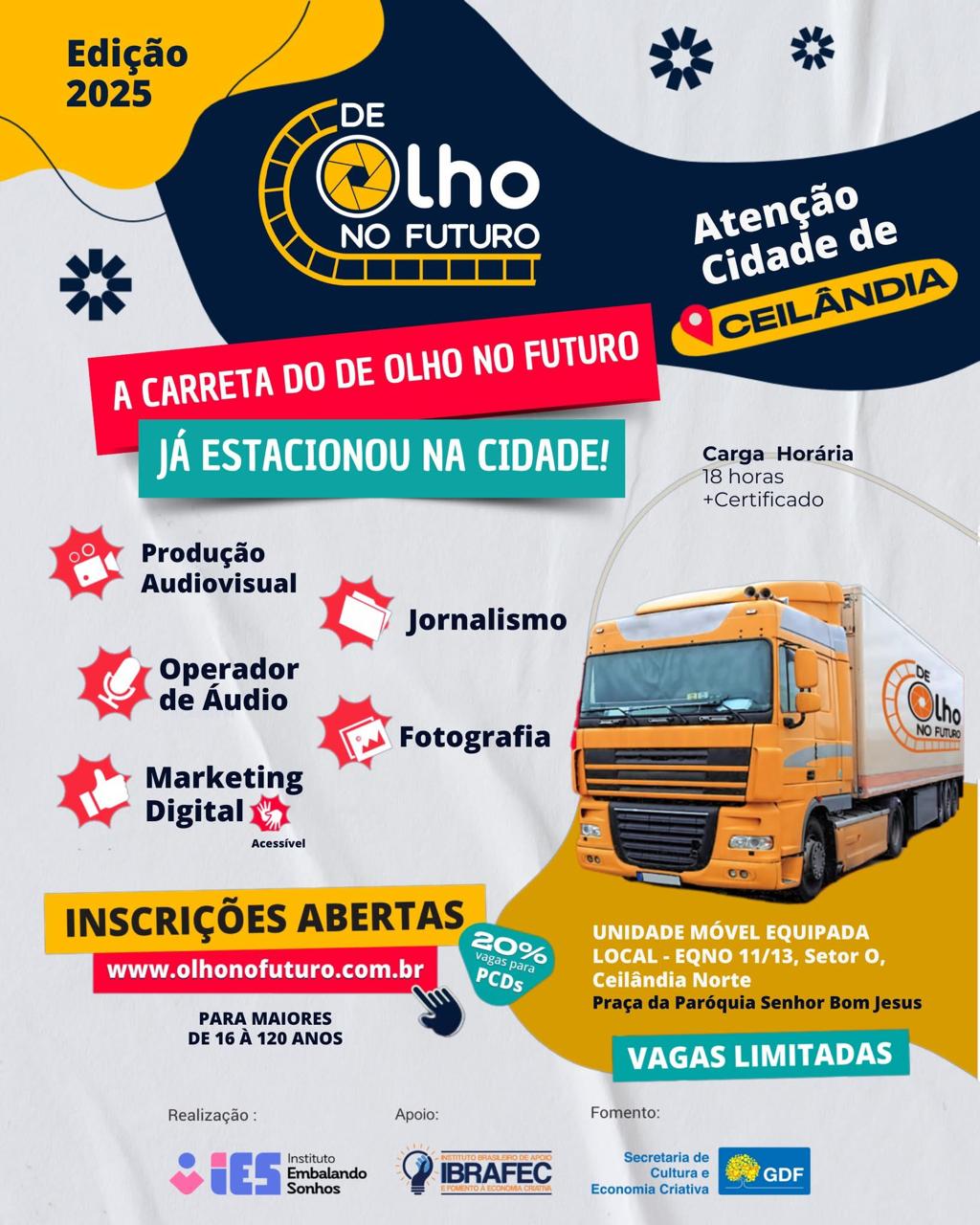 O projeto DE OLHO NO FUTURO, uma realização do Instituto Embalando Sonhos com apoio da IBRAFEC e fomento da Secretaria de Cultura e Economia Criativa do Distrito Federal, visa promover a chamada Indústria Criativa, fomentando negócios baseados no capital intelectual e criativo. Após a etapa em Ceilândia, a carreta seguirá para Santa Maria, que também já está com inscrições abertas.