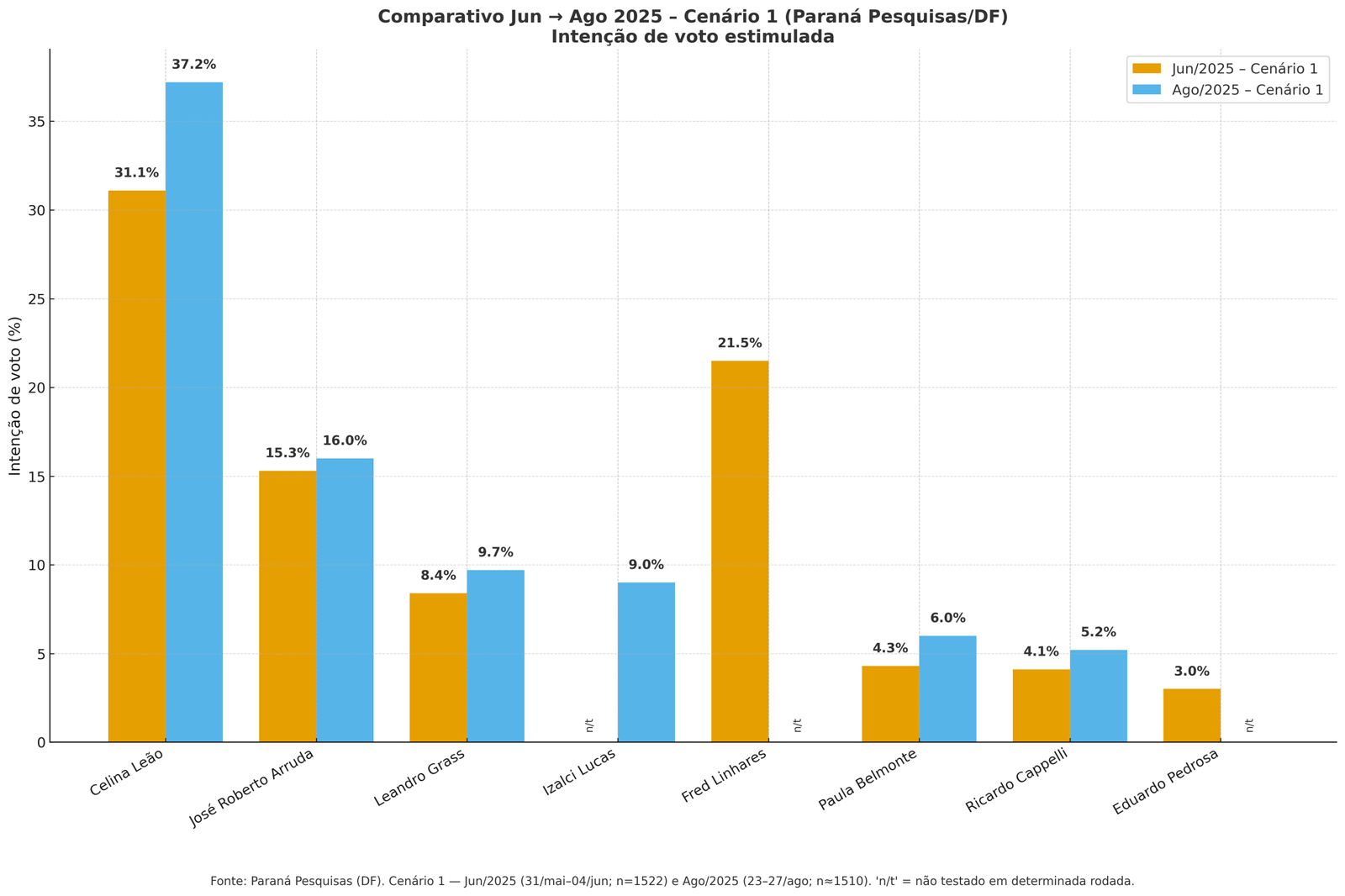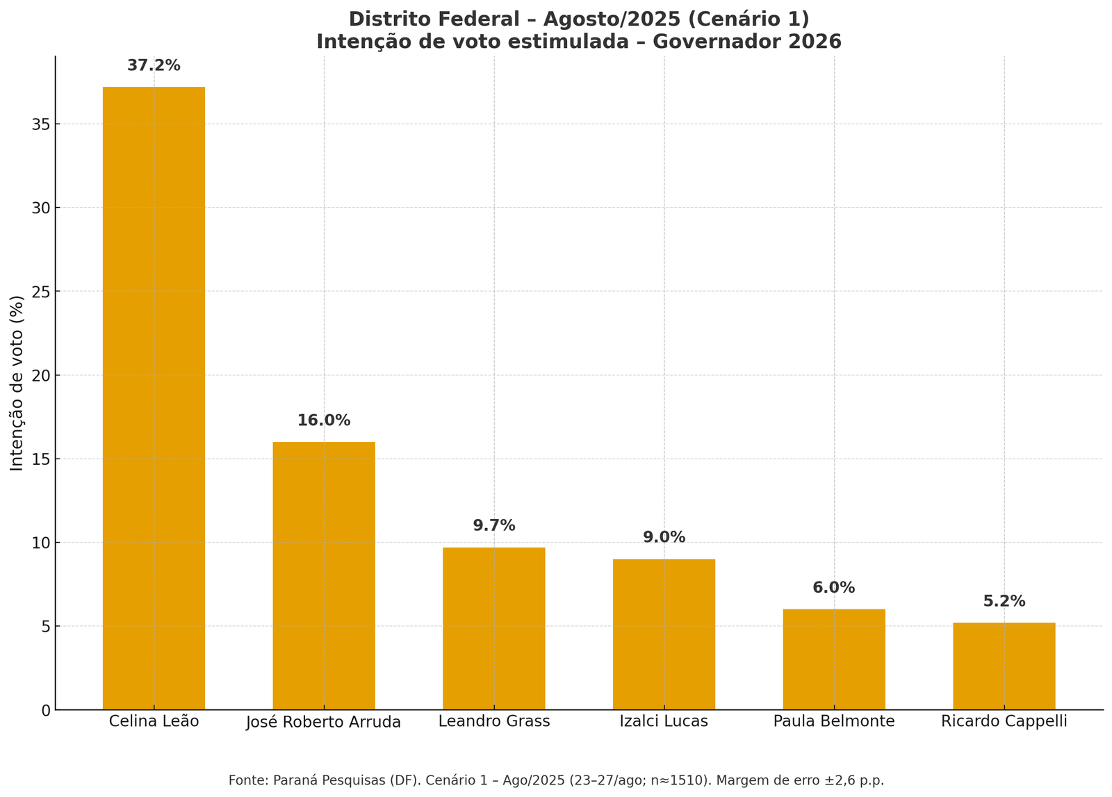 No principal cenário estimulado, que inclui o ex-governador do DF, inelegível, José Roberto Arruda (PL), Celina Leão lidera com 37,2% das intenções de voto. Arruda aparece com 16,0%, seguido por Leandro Grass (PV), com 9,7%, e pelo senador Izalci Lucas (PL), com 9,0%. Paula Belmonte (Cidadania) e Ricardo Cappelli (PSB) registram 6,0% e 5,2%, respectivamente.