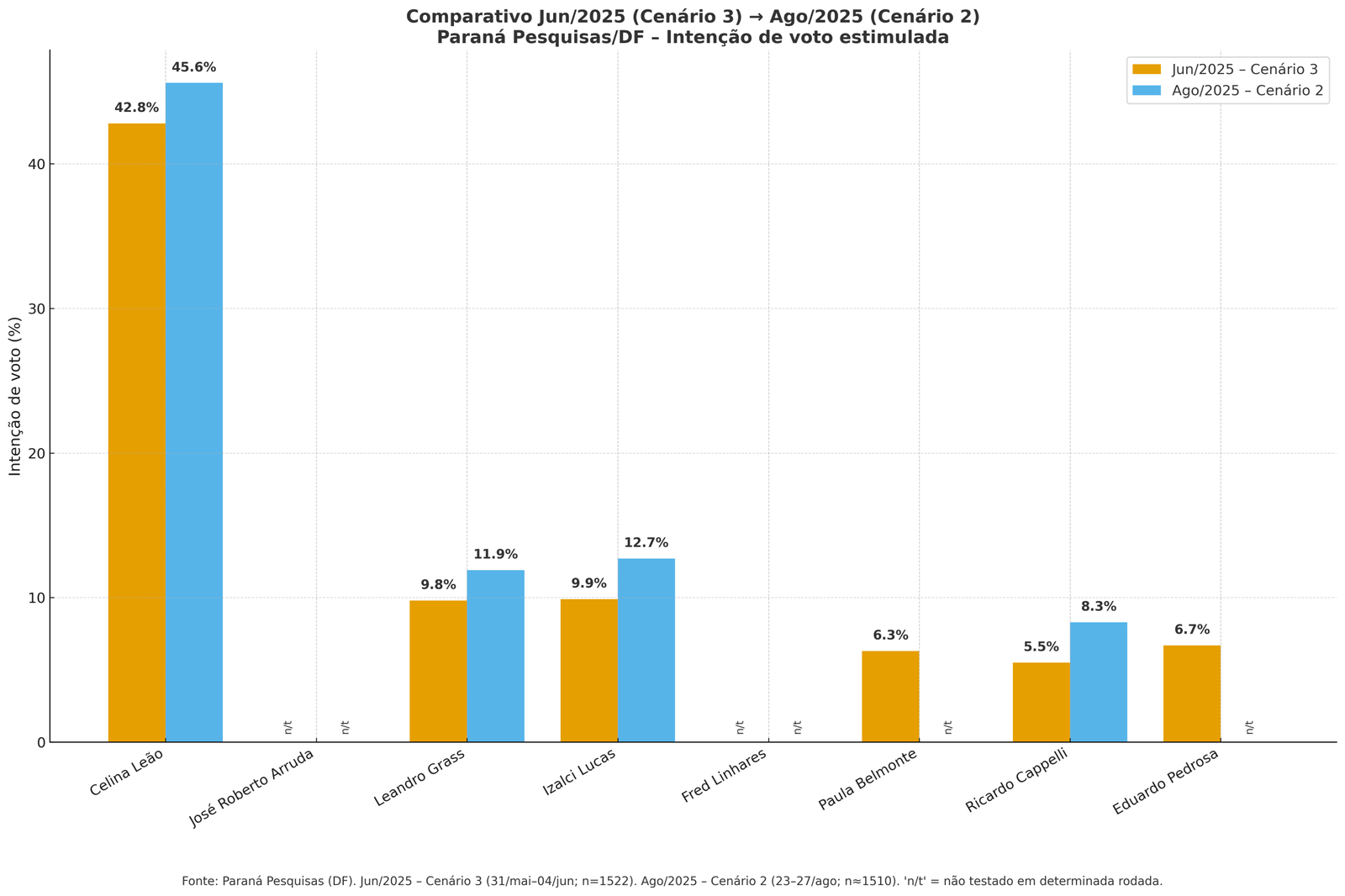 Em um segundo cenário, em que Arruda não aparece, Celina Leão embora cresça timidamente 2,8%, que passou de 42,8% das pretensões de votos em junho para 45,6% em agosto. Mas, no caso concreto a Leoa pontua mais de três vezes, se comparado os concorrentes, que tem Grass na segunda colocação que passou de 9,8% para 11,9%, seguido de Lucas esse com salto de 9,8% para 12,7%.