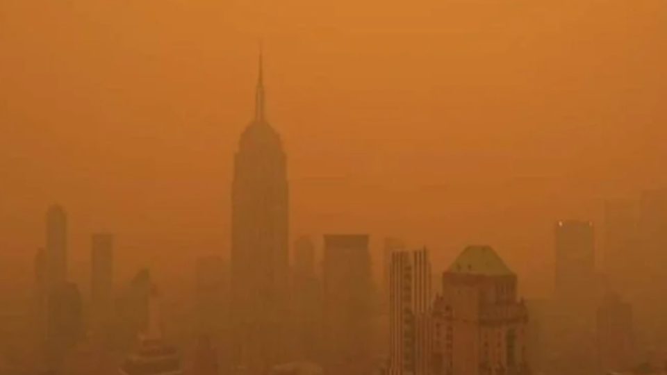 Em Nova York, uma névoa laranja causada pela fumaça cobriu a cidade, escondendo prédios e monumentos. Leia na Gazeta do Povo. Fonte: Gazeta do Povo